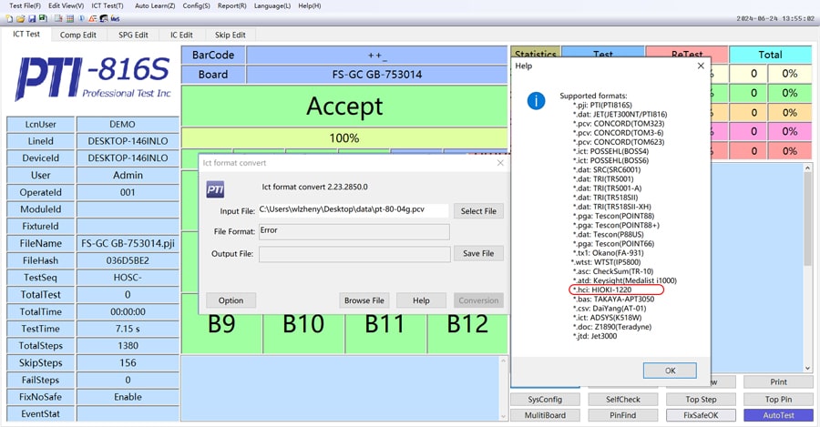 為了實現 HIOKI 1220 測試程序到 PTI816S 的快速轉換,我們開發了專門的程序轉換工具。該工具能夠讀取 HIOKI 1220 的程序文件,并根據 PTI816S 的編程規范和語法要求,自動將原程序中的測試步驟、參數設置、信號定義等內容進行轉換和優化,生成適用于 PTI816S 的測試程序。