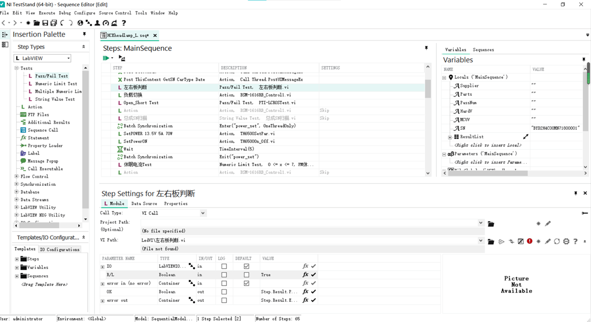 如圖,新建一個(gè)測(cè)試動(dòng)作,導(dǎo)入子VI,在R/L選框處選擇True即可,即當(dāng)接收到硬件端傳來(lái)的True信號(hào)后視為此項(xiàng)測(cè)試通過(guò)。
